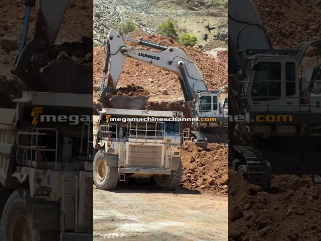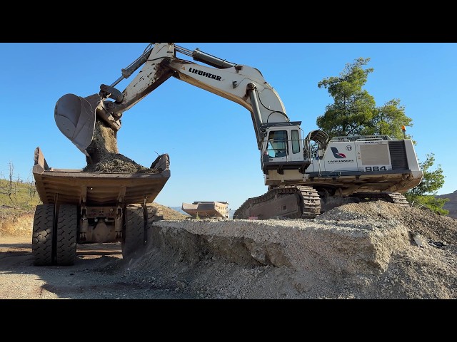 Liebherr 984 Excavator Loads Caterpillar Dumpers